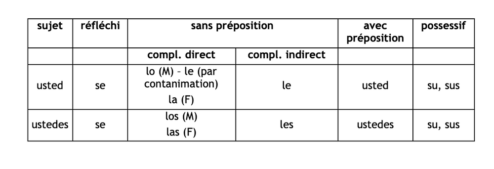L’équivalent du vouvoiement français, aka formule de courtoisie, est l’usage du pronom usted, lequel est la contraction d’un vieux « Votre Grâce » (Vuestra Merced), logiquement associé à la 3ème personne du singulier (Votre Grâce veut-elle un café ou un thé ?). Pour autant, l’accord en genre se fera selon que la Grâce en question est un homme ou une femme (ça vaut pour les compléments d’objet direct et les adjectif).